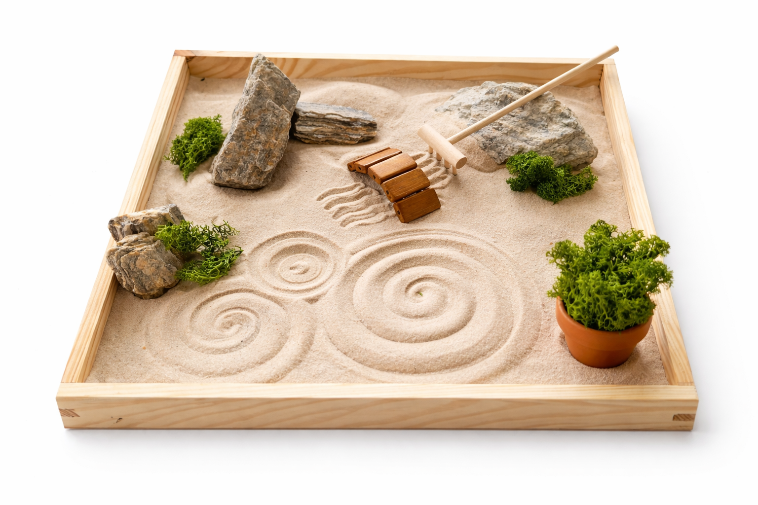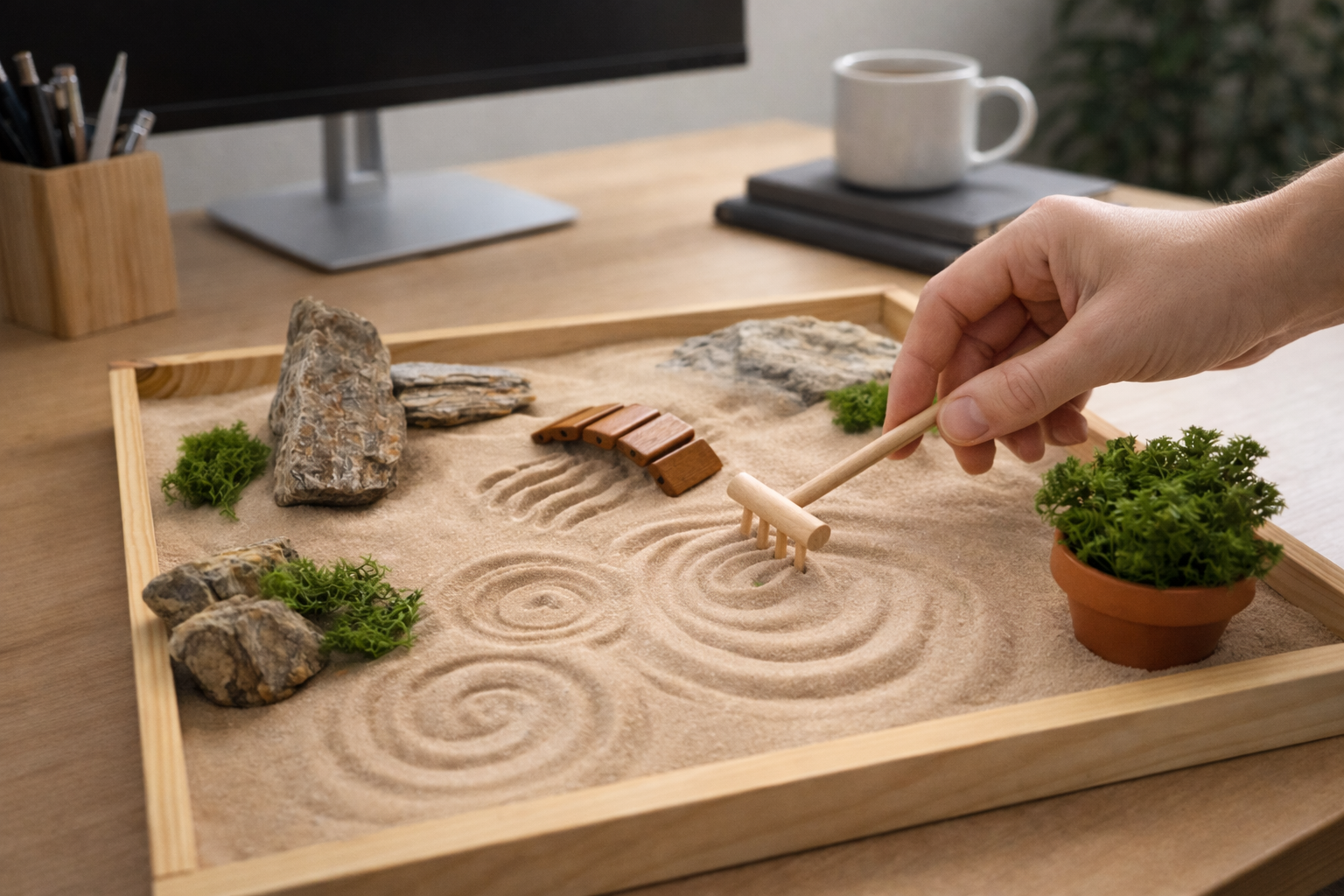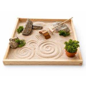 Každý prvek tu má svůj smysl, písek plyne jako myšlenky, kameny dodávají jistotu, mech vás propojuje s přírodou a dřevo tvoří rám, který drží všechnu harmonii pohromadě.