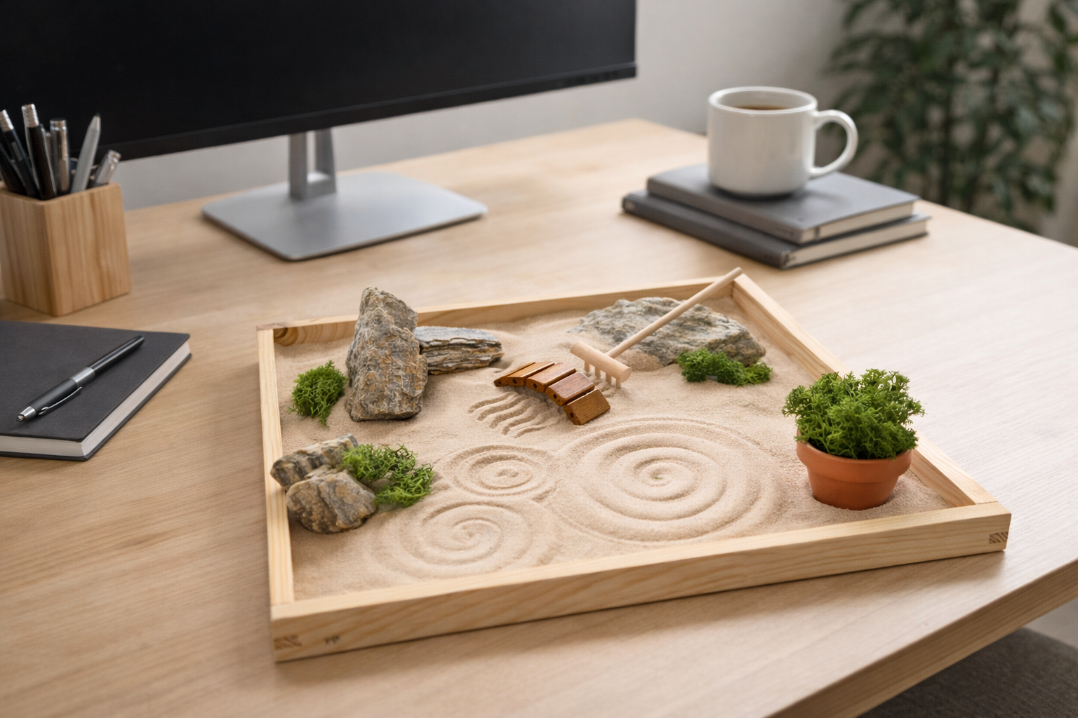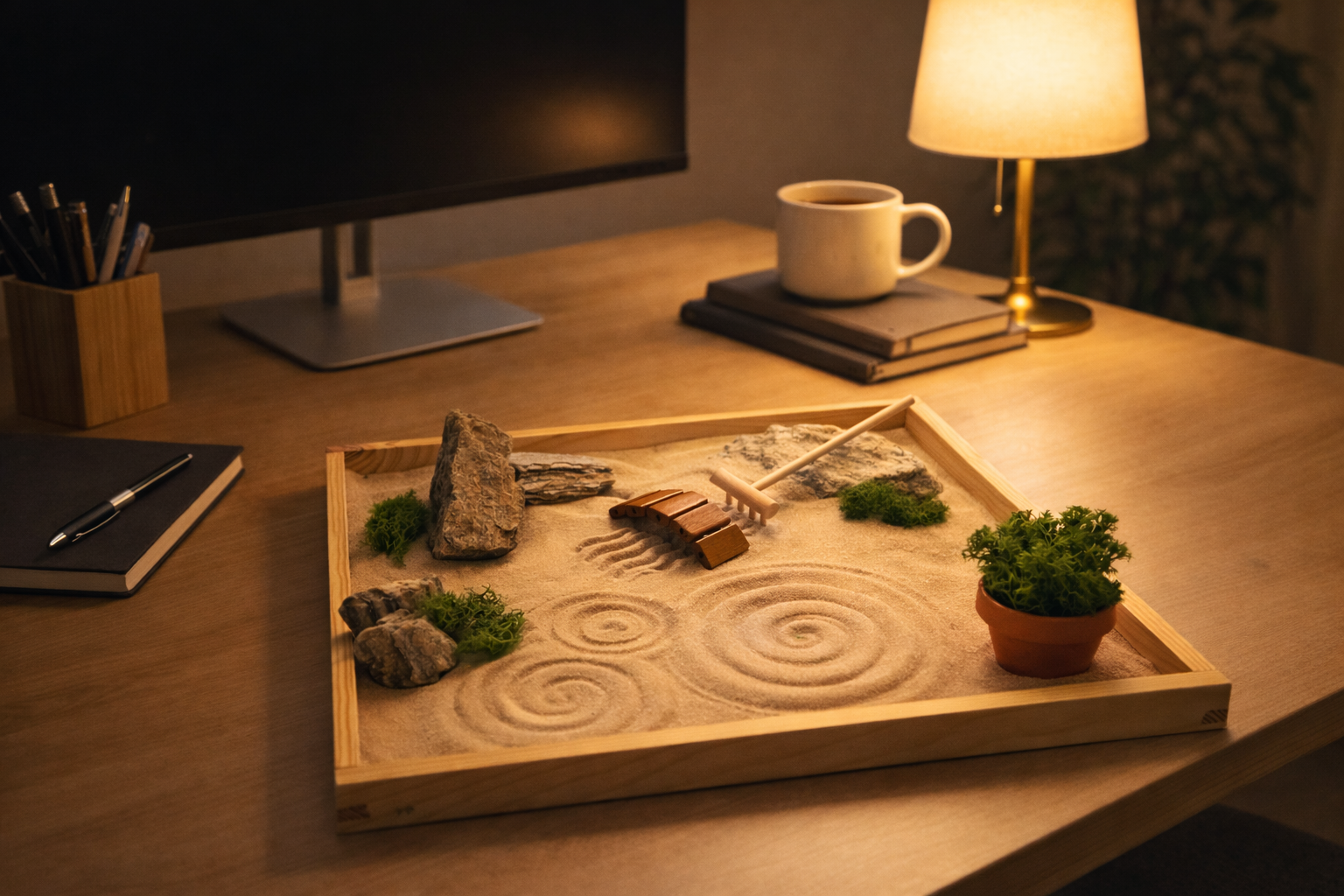 Zenová zahrádka SENSO není jen dekorace. Je to tichý chrám na vašem stole – prostor pro klid i přemýšlení.