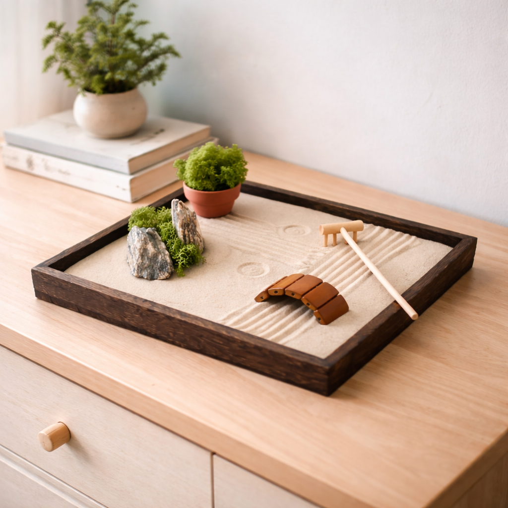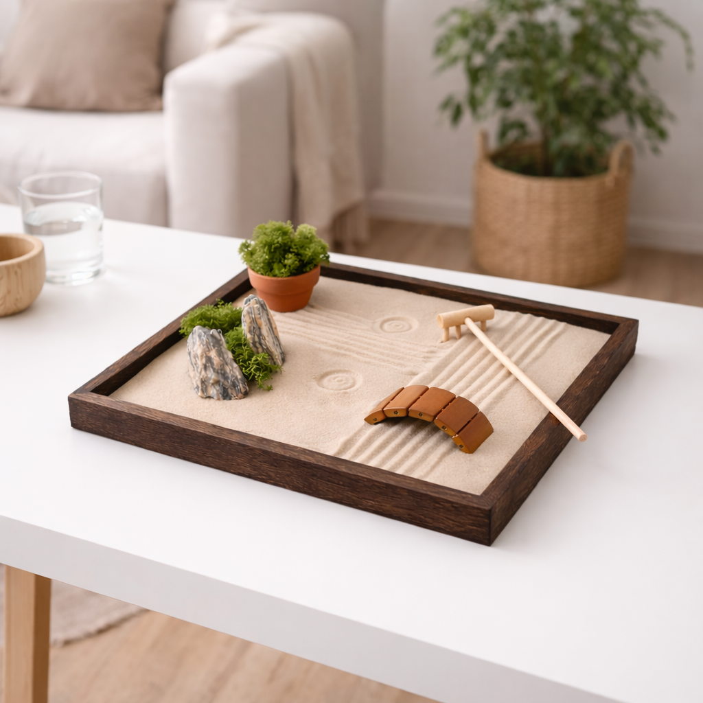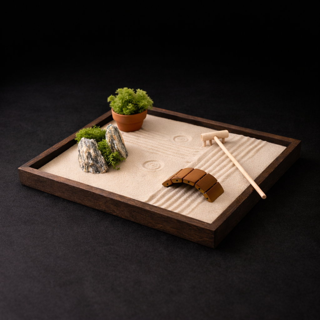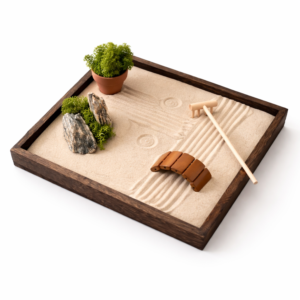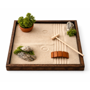 Zenová zahrádka SORA není jen dekorace. Je to malý každodenní rituál. Při práci s pískem se zpomaluje dech, uvolňuje napětí a mysl se přirozeně vrací do přítomného okamžiku. I několik minut denně pomáhá zklidnit myšlenky, obnovit soustředění a najít vnitřní rovnováhu.