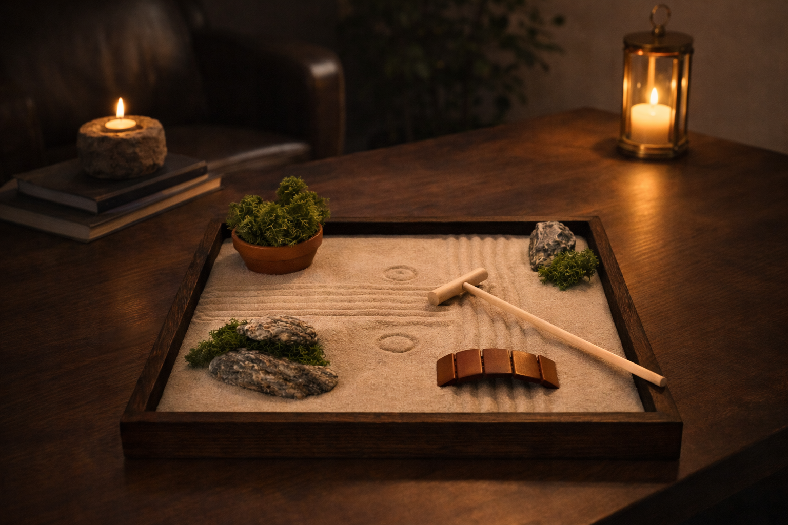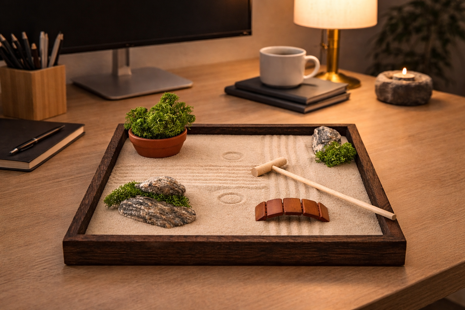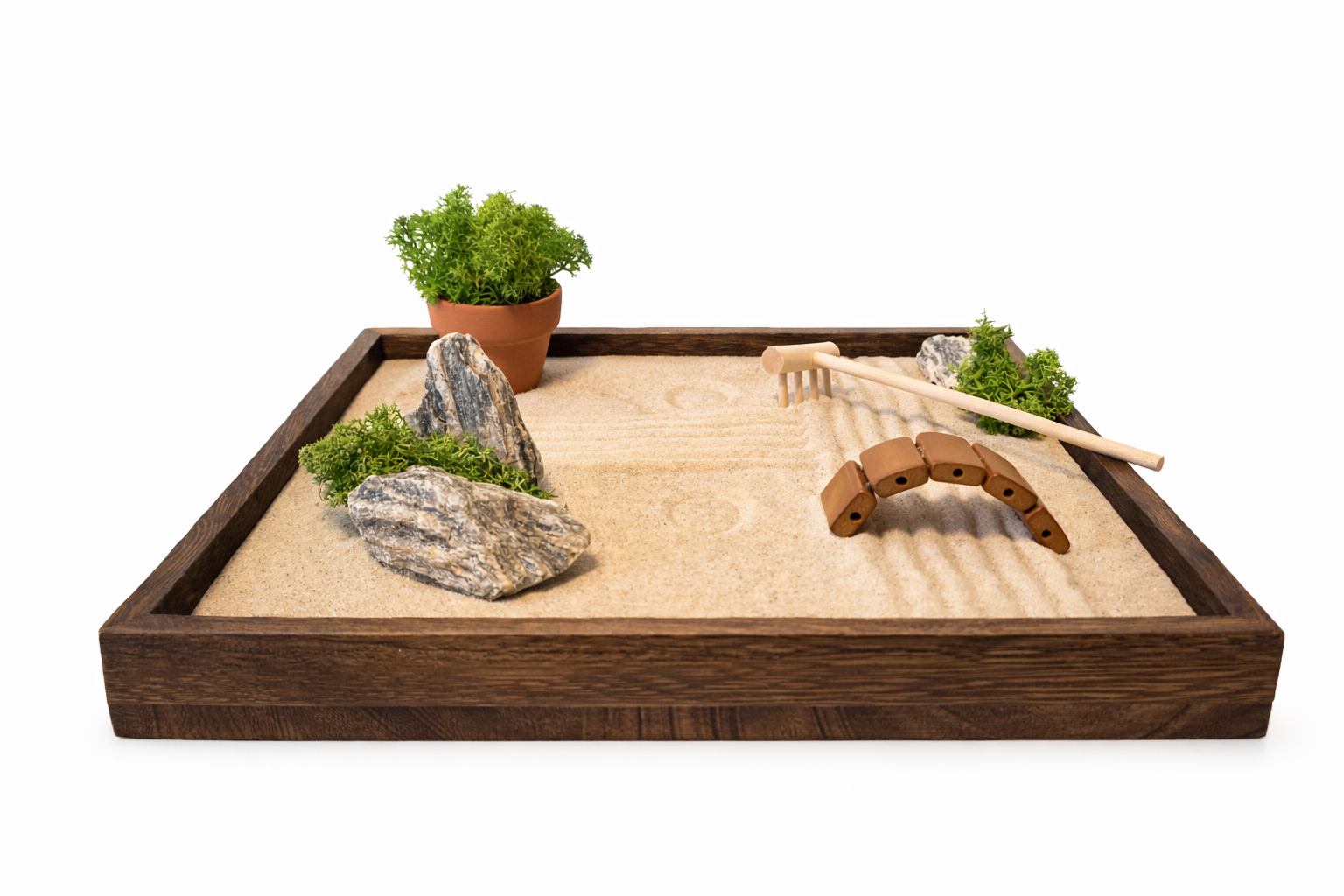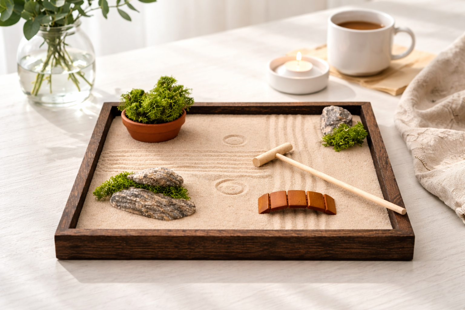 Zenová zahrádka SORA není jen dekorace. Je to malý každodenní rituál. Při práci s pískem se zpomaluje dech, uvolňuje napětí a mysl se přirozeně vrací do přítomného okamžiku. I několik minut denně pomáhá zklidnit myšlenky, obnovit soustředění a najít vnitřní rovnováhu.