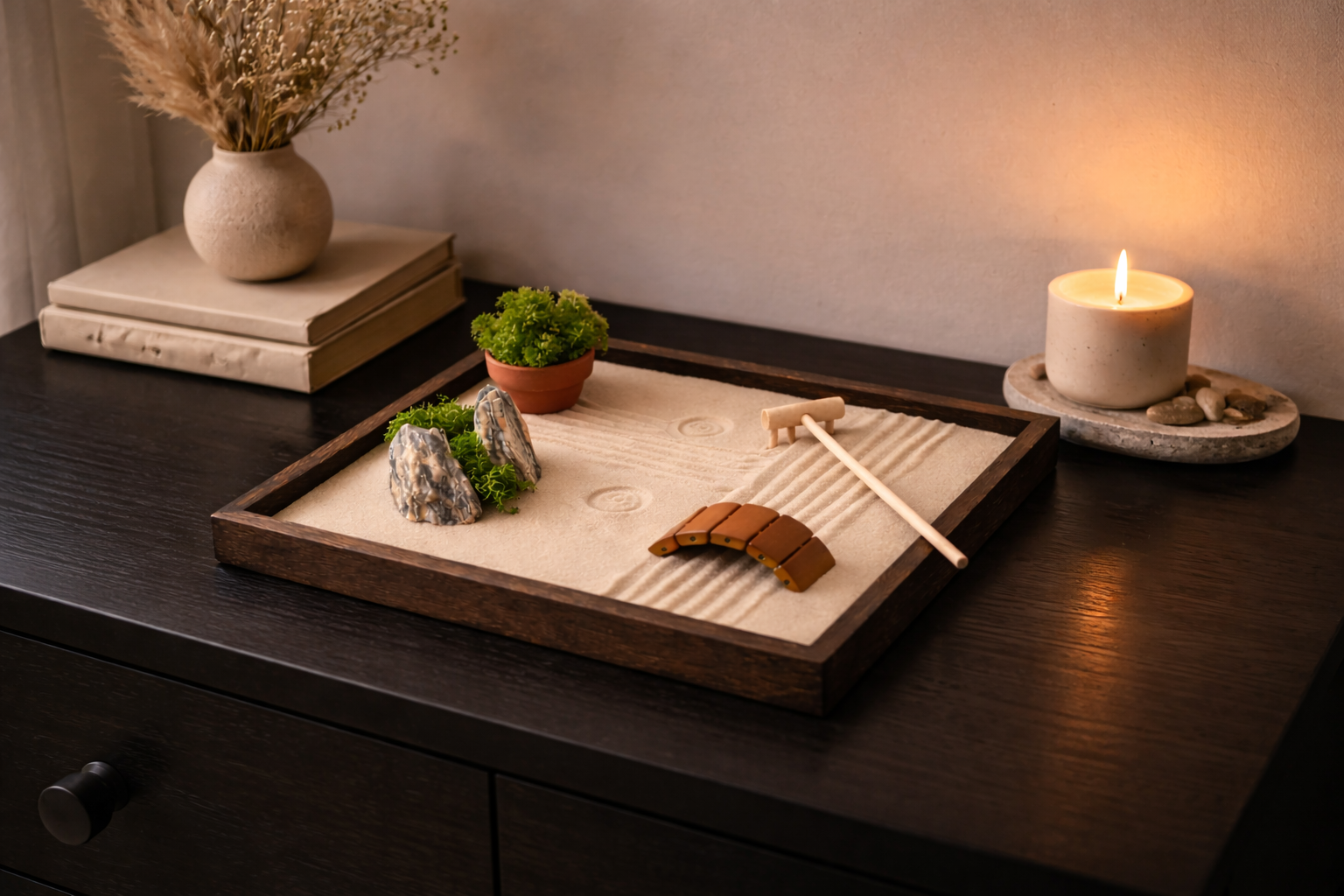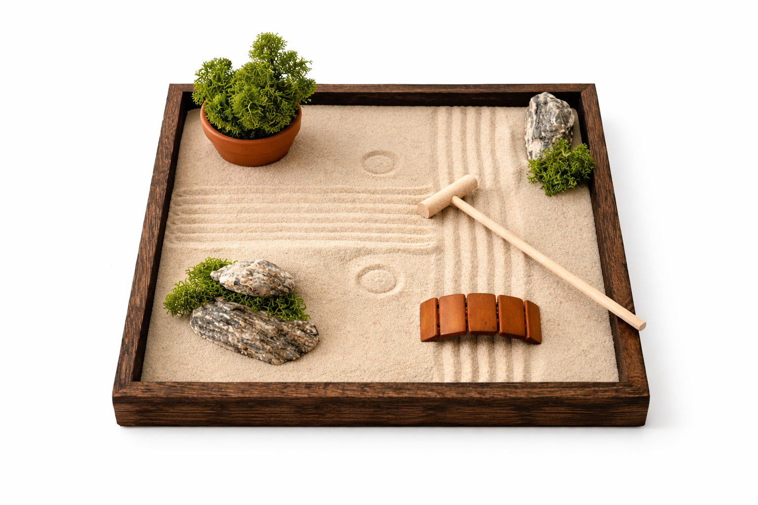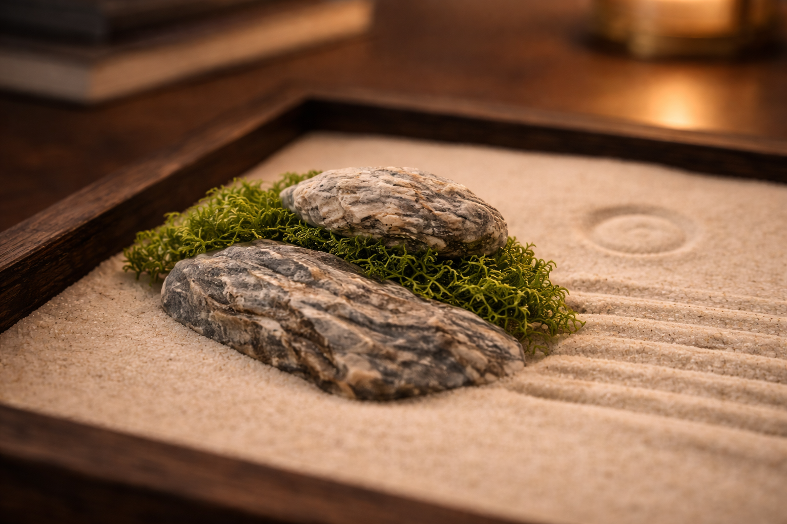 Stres v práci, stres doma, stres v hlavě. Zenová zahrádka nabízí jednoduchý únik z nekonečného proudu podnětů. Podobně jako meditace pomáhá zklidnit mysl, zpomalit tempo a vrátit se k sobě. Bez složitých technik. Jen skrze dotek písku a ticho.
