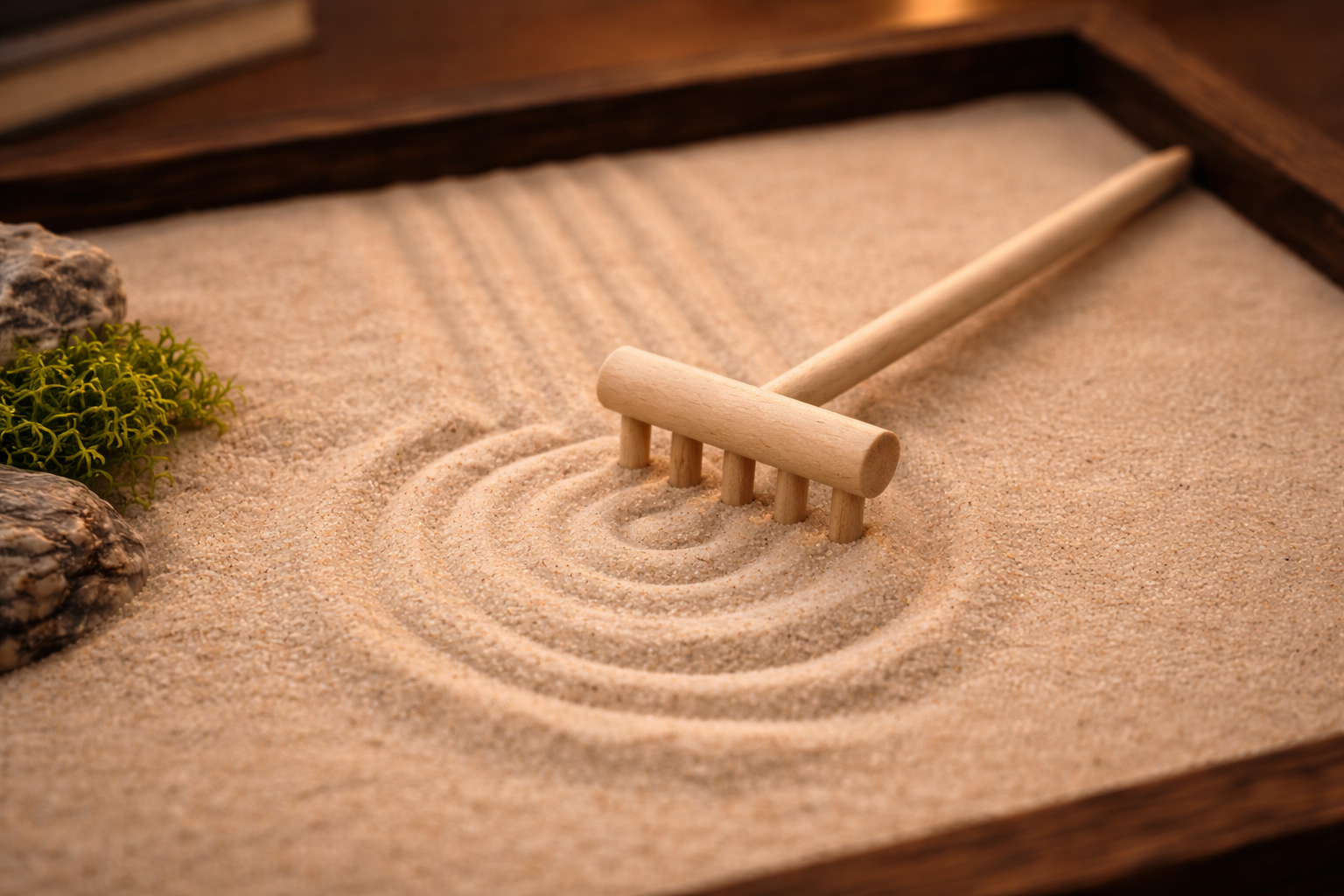 Najděte si klidné místo. Nasypte písek do rámu, položte kameny a začněte tvořit. Hrabte rovné linie, vlny, kruhy. Tvořte krajinu bez cíle a očekávání. Asymetrie je vítaná. Chyby neexistují. Jen proces.